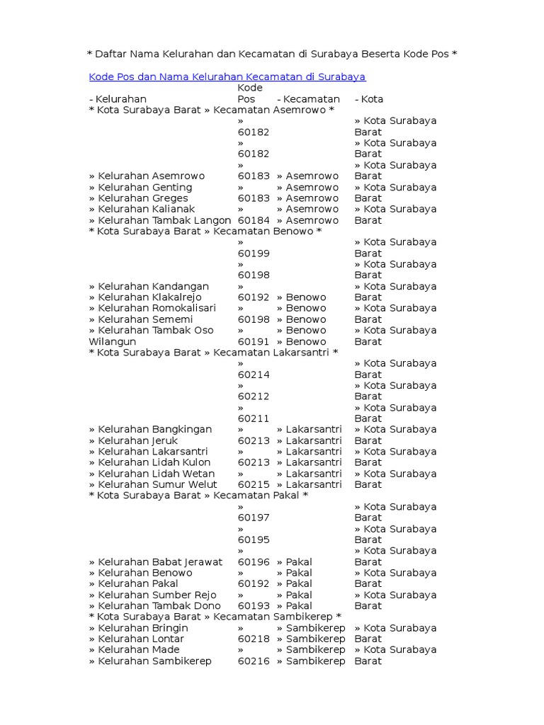 Daftar Nama Kelurahan Dan Kecamatan Di Surabaya Beserta Kode Pos Pdf
