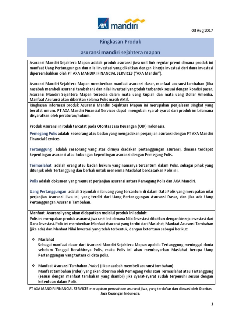 Ringkasan Informasi Produk Asuransi Mandiri Sejahtera Mapan Pdf